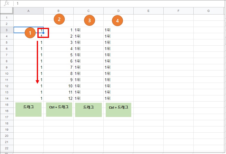 4번 : "Ctrl + 드래그". 동일한 내용이 채워집니다.