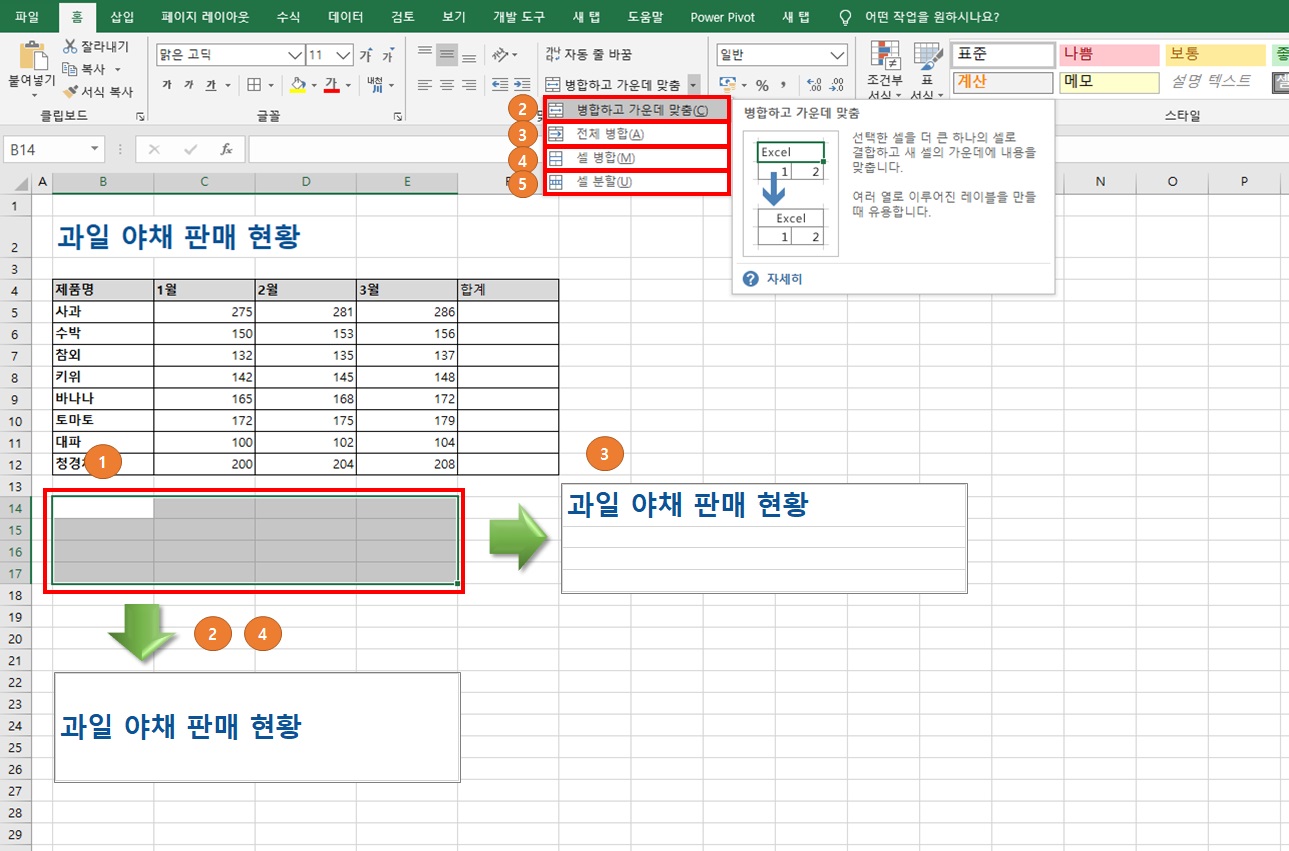 1. '과일 야채 판매 현황'셀을 병합하고 가운데 맞춤 진행