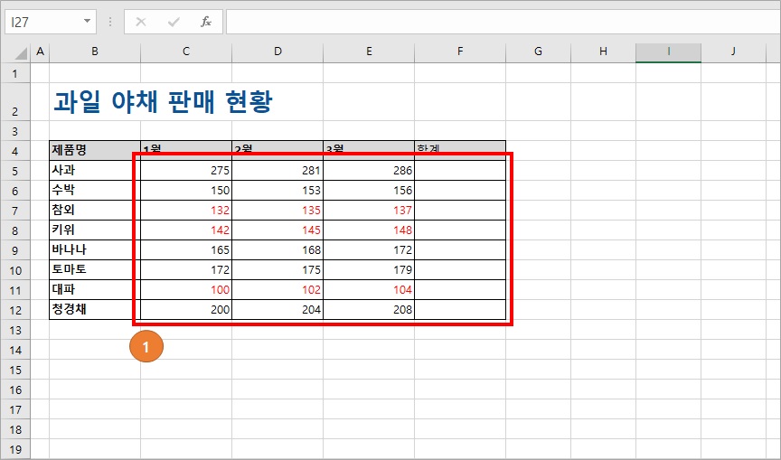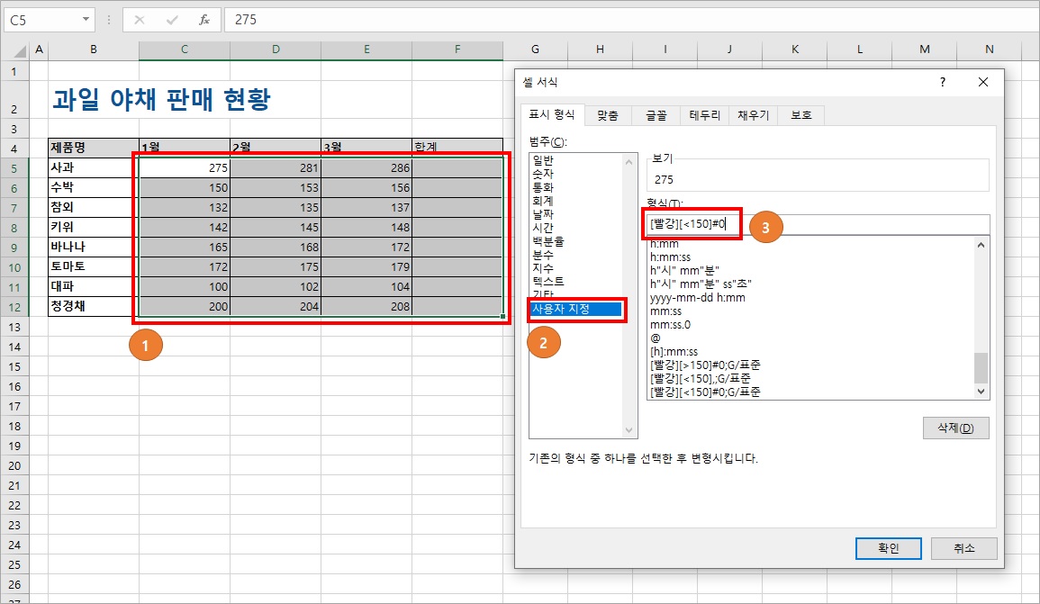 문제) 과일 야채 판매 현황에서 150미만을 빨간색으로 변경하세요