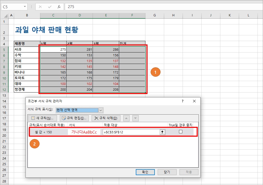 2번 : 범위 셀에 적용한 서식 조건이 보여집니다.